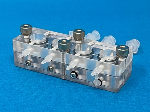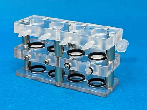 そこで下段の好気ブロックをさらに2分割して、中段のウェルを貫通させ、最下段のブロックにカバーガラスを嵌められるようにしました。カバーガラス上に免疫細胞など仕込めばメンブレン上の腸管組織を透過した腸内細菌の浸潤活性を”見る”ことができます。