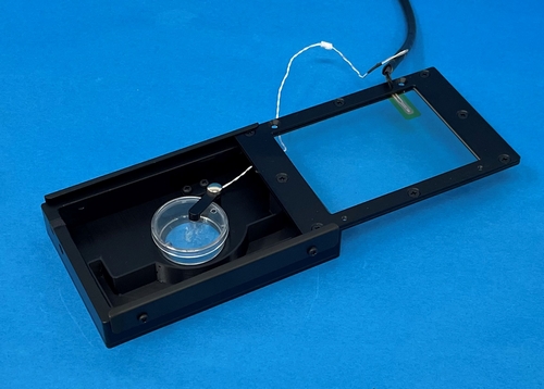 顕微鏡CO2インキュベーターはウェルプレート用「C-140T」とディッシュ用「C-070T」の2種類があって、違いは大きさだけです。ガラスヒーターを設けた天蓋の開閉は「C-140T」がスライド式で「C-070T」はヒンジ式でした。