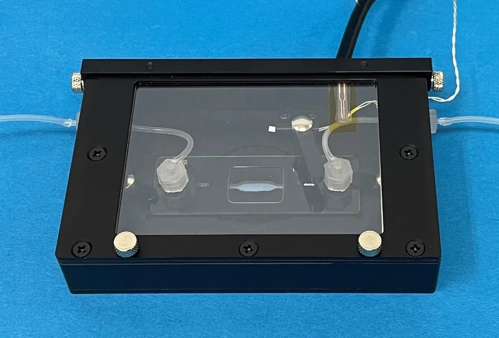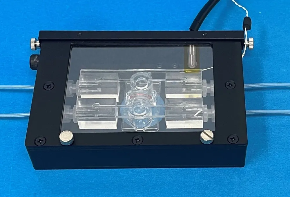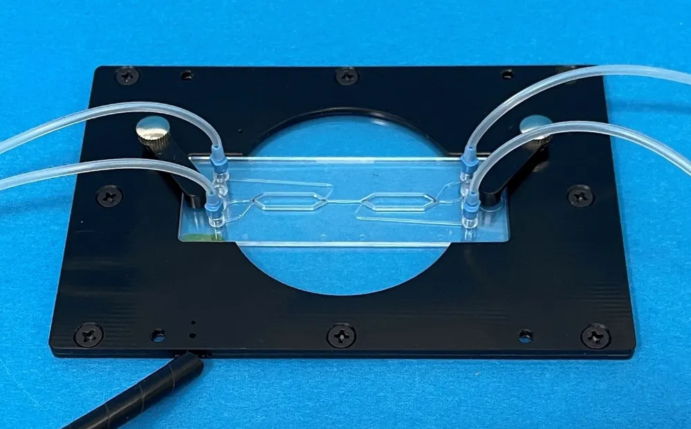 流路を有するMPSは汎用インキュベーターでの灌流培養に煩雑な取り扱いを要していました。ブラスト社のコンパクトな顕微鏡インキュベーターに流路を接続できる継手を設けることで、MPSの温度やガス濃度を簡便に制御します。ポンプユニットとの接続にも対応しています。