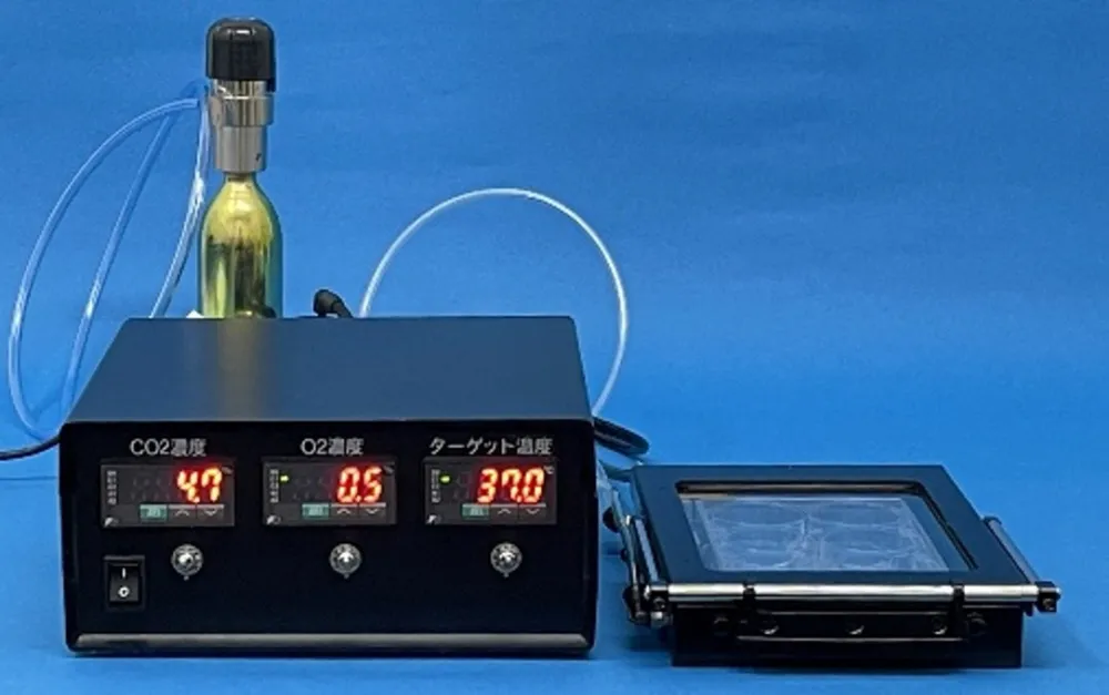 ガス交換が可能なメンブレンを貼付して気液相混合を目的としたMPSを管理します。カートリッジを用いて高圧ガス規制対象外として省スペースにて培養します。顕微鏡ステージに設置することでライブセルイメージングも可能です。